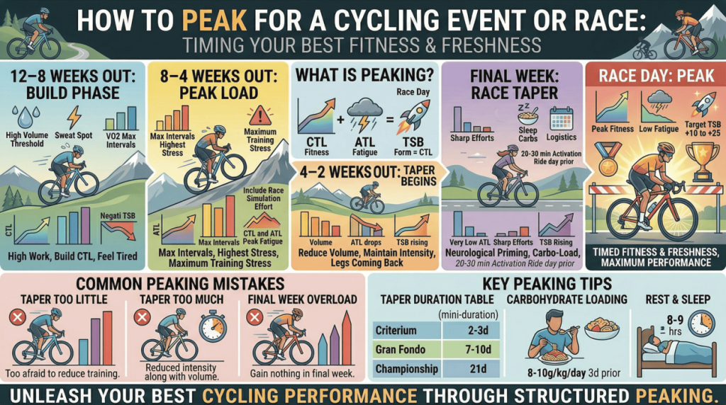 Peaking is the process of timing your highest level of fitness and freshness to coincide precisely with a target event. It’s not just about being fit — it’s about being fit and fresh at exactly the right moment. The science behind peaking involves manipulating your training load to maximize fitness while eliminating accumulated fatigue.