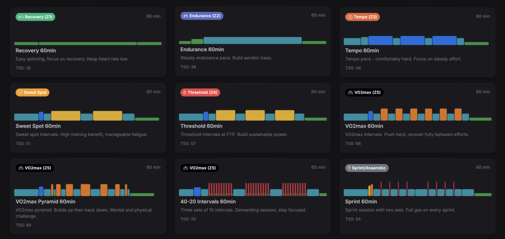 To show how interval structure changes across training zones, here are three contrasting sessions from PersonalBestPace — a sweet spot session, a threshold session, and a VO2max session. Same warmup and cooldown, very different interval patterns.