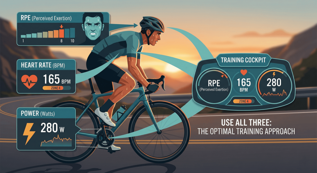 Elite coaches rarely rely on a single metric. The optimal approach is to train primarily by power, use heart rate to monitor aerobic drift and fatigue, and check RPE to validate that your body agrees with the numbers.