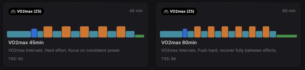 Total work time: 6 × 3 min = 18 minutes at VO2max. TSS: 66. Heart rate at VO2max intensity typically lags behind power — you may not see peak HR until 60–90 seconds into each 3-minute interval. By intervals 4–6, HR will likely hit 90–97% of max and stay there throughout the effort. The 3-minute recovery is deliberately equal to the work interval — resist the temptation to shorten it. Full recovery between efforts is what allows each subsequent interval to be done at true VO2max intensity. see a calculator here : VO2 Max and training calculators