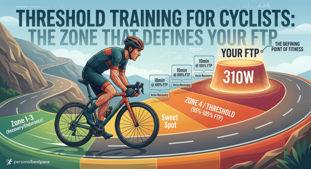 Threshold training (Zone 4) targets 95% to 105% of FTP — a notch harder than sweet spot. The key difference is recovery: after a genuine threshold session you typically need 48 hours or more to recover fully. After a sweet spot session most riders recover within 24 to 36 hours, which means you can fit more productive training sessions into your week.