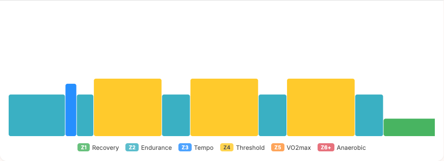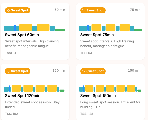 PersonalBestPace includes Sweet Spot workouts from 60 to 150 minutes, all structured around intervals targeting 88% to 93% of your FTP with timed recoveries. The AI coach schedules sweet spot sessions within your training week based on your current fitness and fatigue levels, so you always arrive at these sessions with enough freshness to actually execute them at the right intensity.
