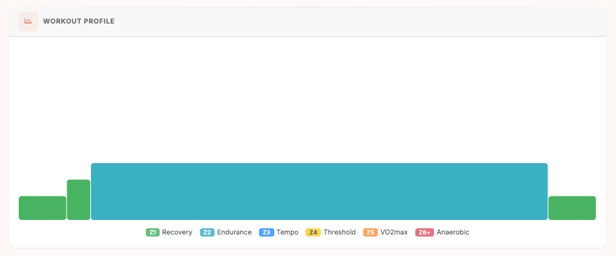 | 10:00 | 70 min | 56–75% | 65–75% max | 85–95 rpm | Main — steady Zone 2 |